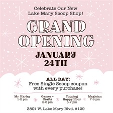 Celebrate Kelly's new Lake Mary Scoop Shop GRAND OPENING on January 24th! Featuring Crafts, Music and Magic throughout the afternoon!